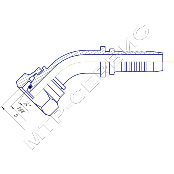 Фитинг гидравлический DKOS углового исполнения 45гр, тяжелая серия. Гайка накидная с метрической резьбой DIN 3865. Посадочный конус (конус уплотнения) 24 градуса, на конусе уплотнительное МБС кольцо. От фитингов серии DKOL отличается диаметром посадочного конуса - смотри столбец Pipe трубка.